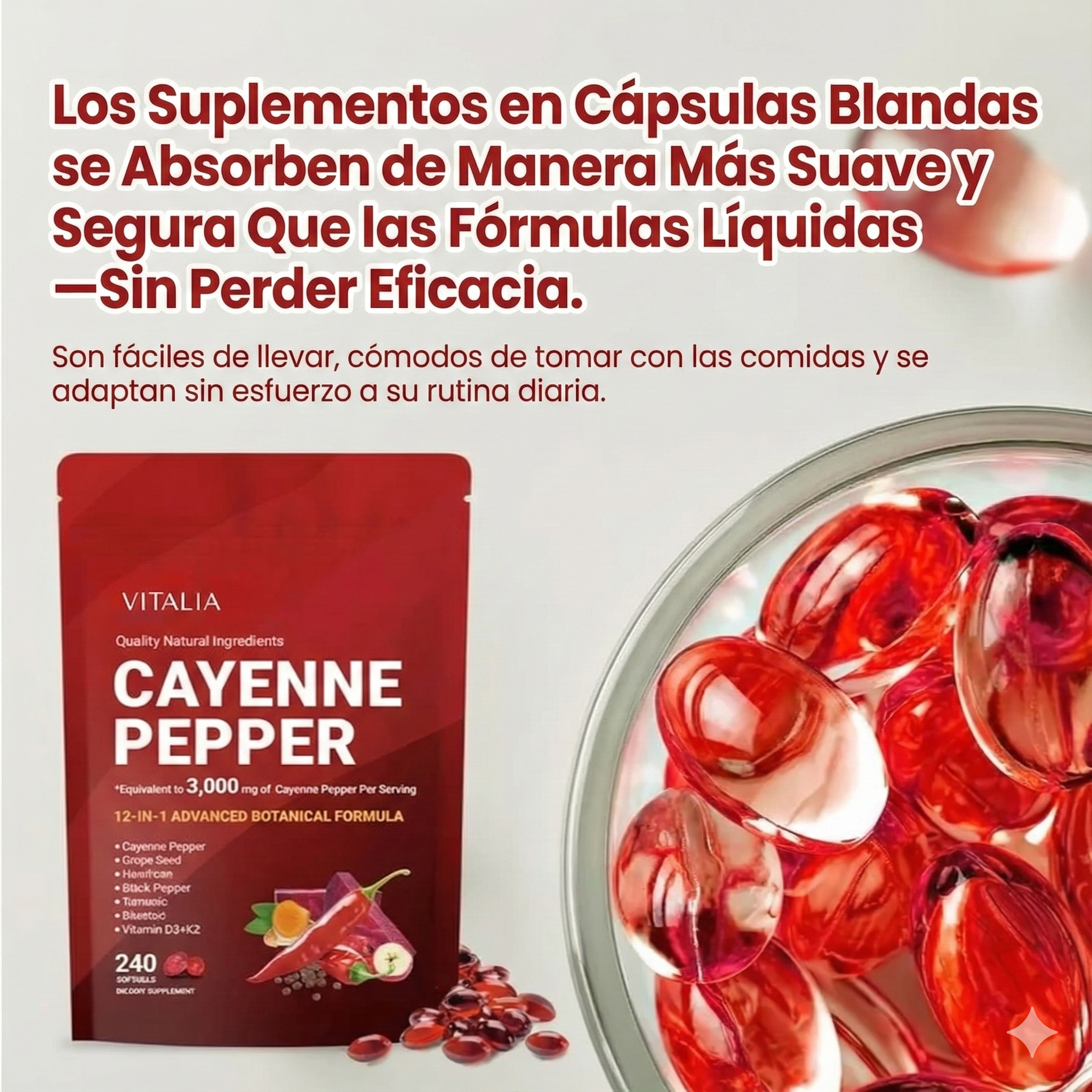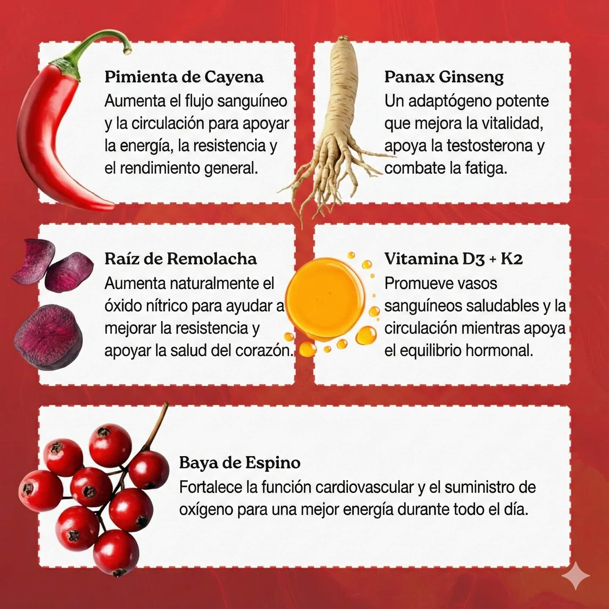 Estas cápsulas de cayena restauran el flujo natural para que tu cuerpo genere su propia vitalidad duradera. Notarás mayor concentración, resistencia y energía constante sin bajones.